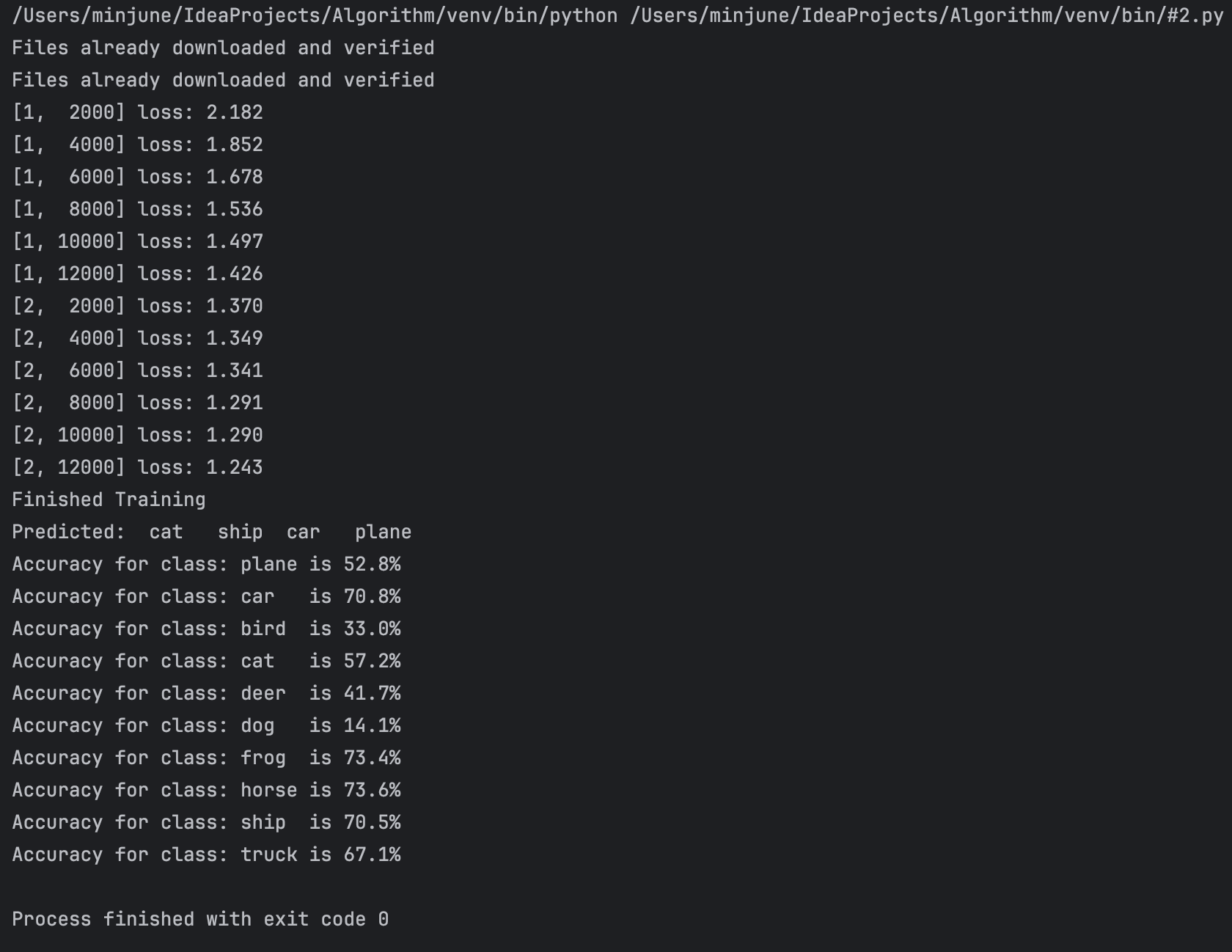 2주차에 작성한 Pytorch 를 활용한 딥러닝 모델을 torchvision의 CIFAR10 데이터셋을 활용해 실행했습니다